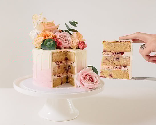 Our white chocolate mud cake FILLED with rainbow sprinkles throughout! And filled with a sprinkly buttercream